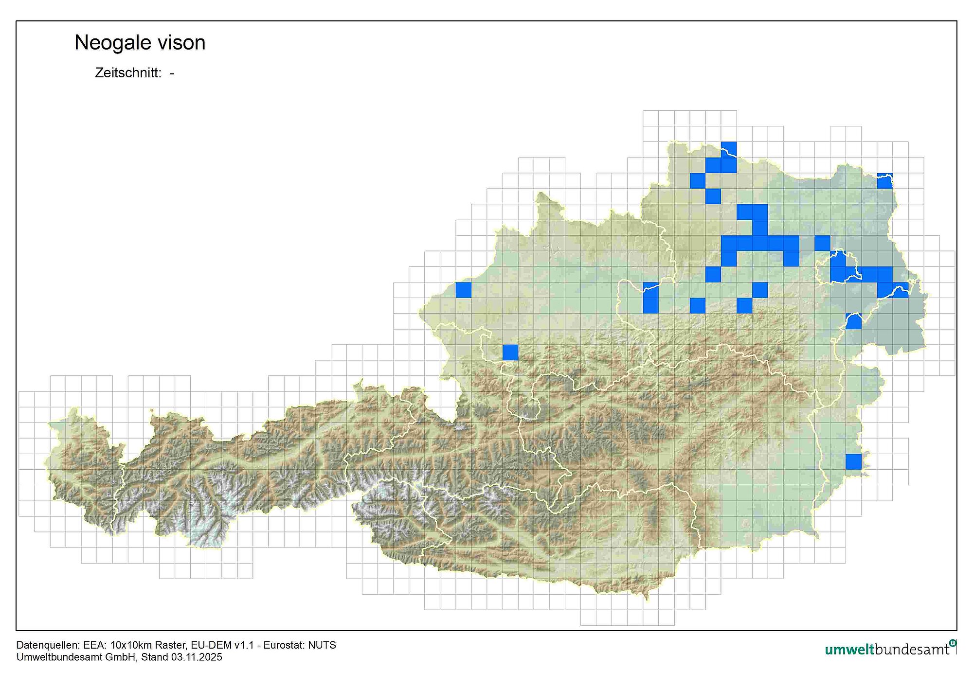 Harrington, L.A., Adriaens, T., Rabitsch, W., Rorke, S., Maran, T. & Podra, M. (2024): Risk assessment Neogale vison. Study on Invasive Alien Species – Development of risk assessments to tackle priority species and enhance prevention. European Commission. Link