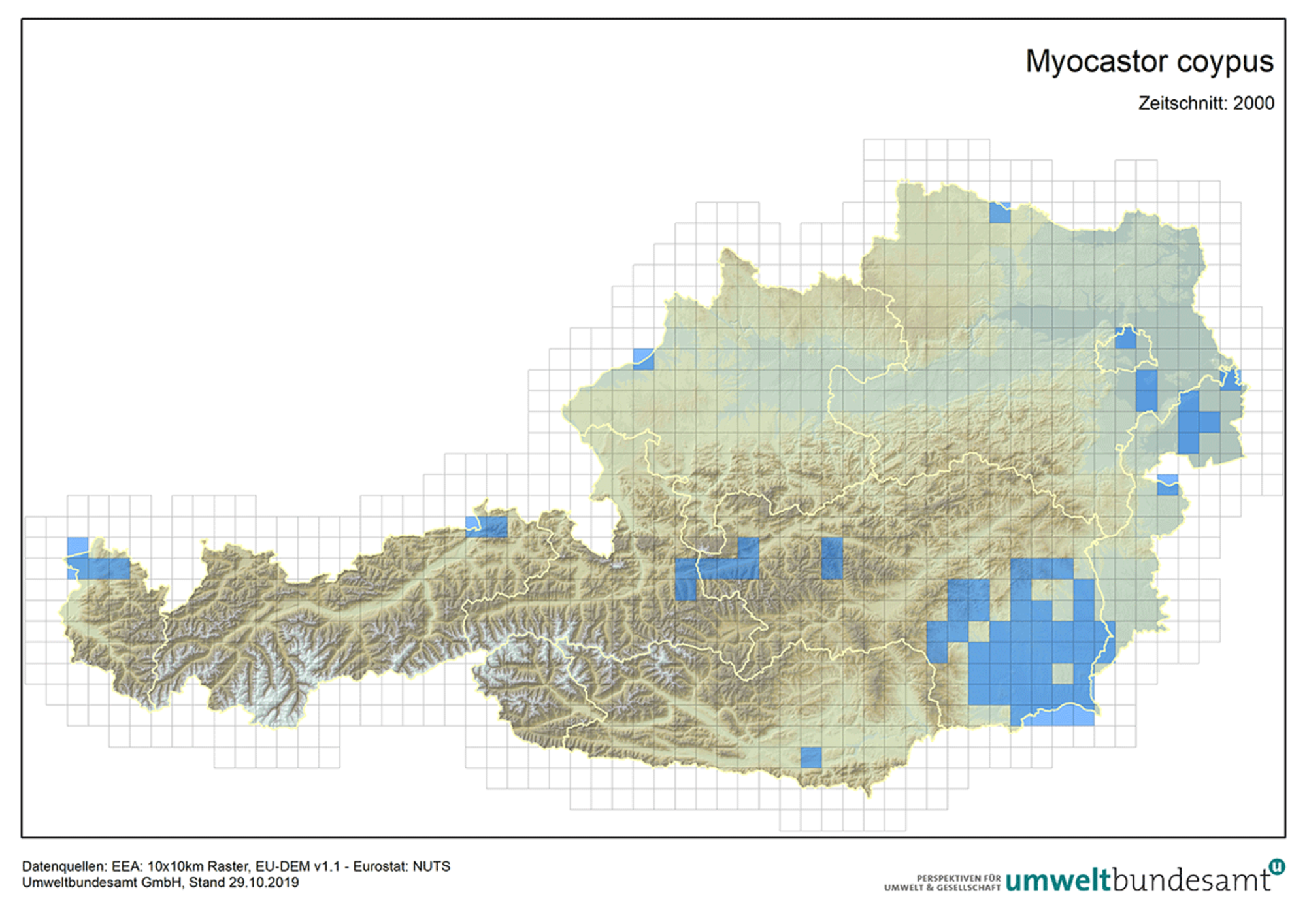 | Erstfund in Österreich | In den 1920er- und 1930er-Jahren existierten mehrere Nutriazuchten in Niederösterreich und Salzburg. 1930 wurde ein Tier in Salzburg in freier Wildbahn erlegt, 1932 wurden Tiere in Vorarlberg freigesetzt. |